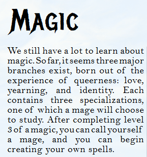 Monsterhearts doesn’t have lore, really. It has some suggestions on how to set up the world, and its mechanics certainly offer implications for the world, but, you can’t sit down and read the history of the city it’s set in, you make up your own. All the game has to offer on that front is what it’s like – an impression of the story, not the details.