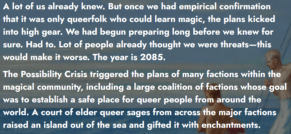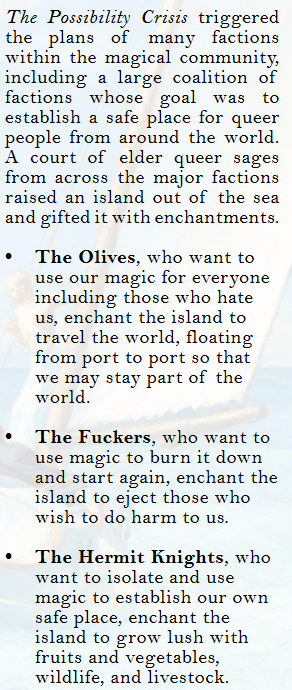 The common factor between these three games, in my eyes, is the [world as a puzzle box]. And I don’t think that’s the only model wherein the premise of the world provides significant structure to the gameplay, but it is one of the only ones I like, so it’s a good place to start.