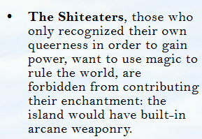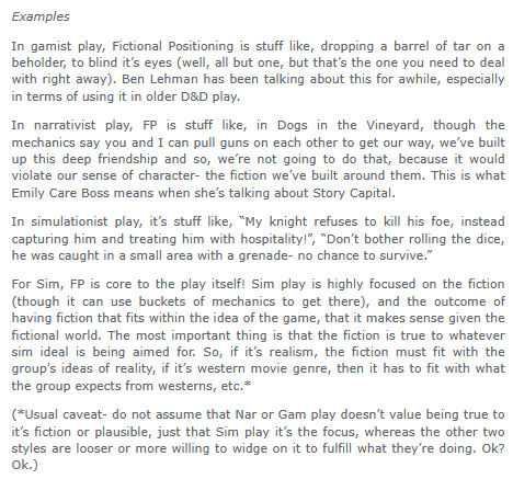 That’s also the strength of fictional rules. Not the social paradigm, the impressionist nature. It is very hard to write a system of formal rules that [feels right]. That’s part of what the art of game design is, and it’s an unsolved problem. Fictional rules, however, can take it as given. They just need to write a piece of text that evokes a certain feel, and then get the players to take that feeling and interpret it. And, as we all know, writing fiction that [feels right] is a trivial task hardly worth mentioning.