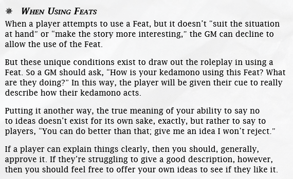 This is one of the big reasons I don’t like this sort of design. It’s all subjective and internal and messy. The process of translating lore to internal rules is one of constantly asking the question, have I read this text correctly? Have I identified the important parts and distinguished them from the fluff? And, can I expect that the other people I’m playing with have read it in the same way that I did? There’s a significant risk if you get it wrong, too – not only can there be out-of-game social reprisal, even just within the context of gameplay, a jarring shift and need to recalibrate your internal rules can take you right out of the game, in a way that makes it hard to get back in. Sometimes that can happen because of what the mechanics do – I’m of the mind that most disgruntled stories about unwanted character deaths come from a mismatch between fictional rules (of character death as a rare, impactful, and satisfying occasion to be built up to) and formal rules (once you hit -10 HP you’re out) – but the more fictional rules are relied on, the more a mismatch between two players’ interpretations can cause the same thing.