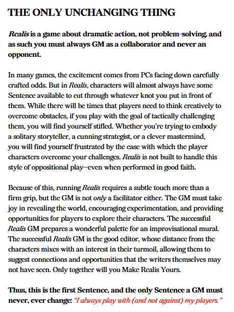Reading that makes me pause, you know? A rule is a flag, in an RPG. If a game includes a rule for something, it’s telling you, “hey, this is a thing that’s supposed to happen.” If a game includes rules for something that isn’t expected to be a part of the game, then, it’s wasting ink. Sometimes, you get games that write intentionally punitive rules to tell the players to avoid that subsystem. To be honest, I hate that, and judge a game harshly if it ever does that – but even then, what that does is establish the happenings of that subsystem as something that is expected to come up in the process of play had those rules not been there, and then flag the players away from it. There are no neutral subsystems, because their conclusion in and of itself is a statement.