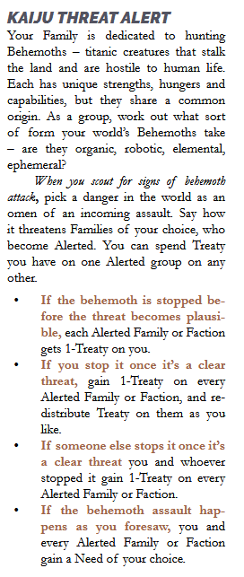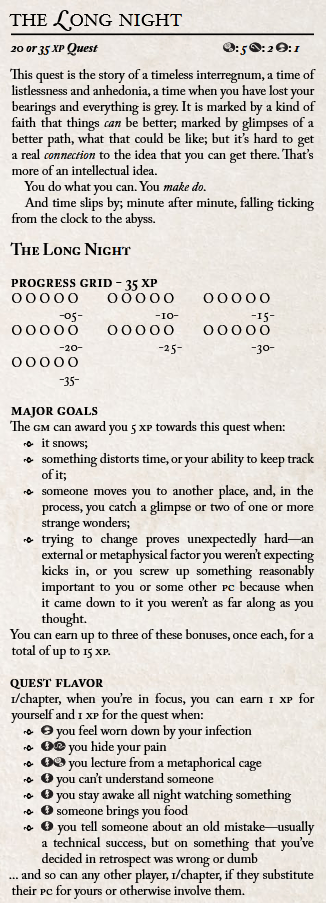 It can be hard to differentiate what does and does not require the solidity of a mechanic. For Exalted and Monsterhearts both, they specifically provide formalized powers to enact certain concepts and tropes presented by the world, which crystallizes them as important within the fictional rules, and also just makes them real. There’s no way to read those games without those aspects being solid enough to mean something, since, they made formal rules for the things, after all. Generally, predictably, I err on the side of mechanizing where possible. But both games work on what I described in the Ghost Engine essay as [aspic design] – the mechanics float in a sea of human interpretation, of fictional rules. I think the question, “what are the important steps of gameplay, and how do the players move between them?” is the key one to keep in mind, and, at minimum one of [an important step] and [how players reach that point] should have the solidity behind it to keep the game’s shape recognizable. The use of fictional rules is to keep things flowing smoothly throughout that process.