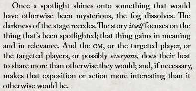 The presence of the rule makes me think about love more. It turns that into a threat vector – a dimension of my character that I need to consider in order to efficiently solve the puzzle of the world. How do I wrangle my character’s secret passions mid-adventure without being obvious about it? It’s the same sort of question as, how do I use my powers without accidentally breaking the masquerade, which Nobilis also asks – but it poses an advance consideration that twists the gameplay around it.
