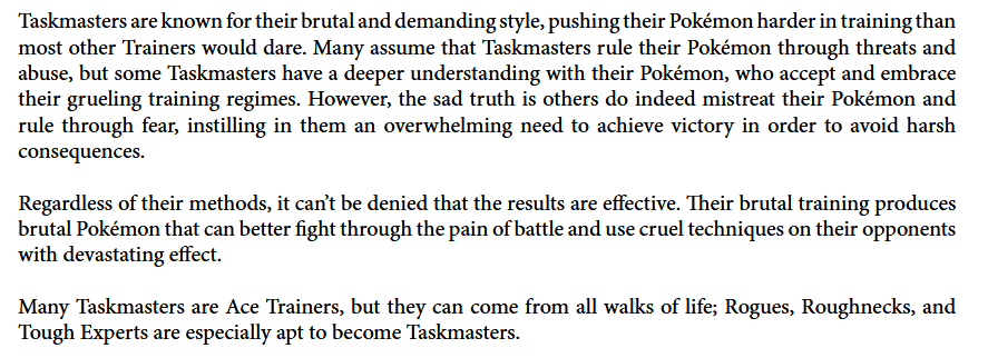 It’s a class about pushing your pokemon for power, applying Injuries and fatigue in return for some fairly sizable buffs. The text blurb does comment on it being a way to represent mistreatment, but also other demanding training styles. Much of the time, however, it gets discussed in a far worse light. A common attitude among newcomers to the community is that the class is intended to be evil-only, and players shouldn’t be allowed its options at all (or should be judged for taking them). This attitude would be silly in any context, but made worse by the fact that Taskmaster is genuinely a quite solid class, a powerful option that players would plausibly want to take. “Fluff is free”, then, gets invoked in response. One can take Taskmaster for its powers without it implying abuse. It says so right there, but also, it doesn’t have to imply anything at all. (Much like my Necromancer investment back in Fabula.) You could take Taskmaster because your pokemon just push themselves harder on their own right, if you really felt the need for something. You certainly don’t need to give every NPC who’s portrayed as abusive some Taskmaster powers. These are game elements, serving a mechanical purpose, and the more you arbitrarily tie assumptions to that, the worse the game gets.
