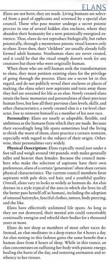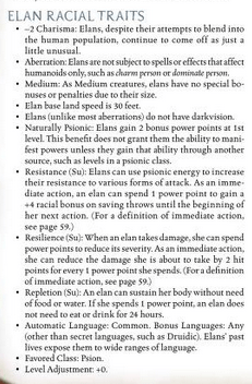 The reason for that, of course, is it’s informed by the fluff. It’s there to enforce it, to reify it. Elans have transformed themselves into something notionally immortal. Hence, they can channel their innate powers into being immune to a natural death. They have those innate powers because the ritual to reform them is a psionic awakening. Discarding their old humanity makes them hit the uncanny valley, so they have a charisma penalty and count as Aberrations. Each of these mechanical elements is contextualized and informed by the fluff they’re attached to.
